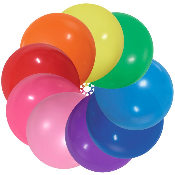 Цветовая палитра латексных шаров «Ассорти» состоит из 10 цветов: белый, желтый, зеленый, голубой, синий, фиолетовый, розовый, фуксия, красный и оранжевый.