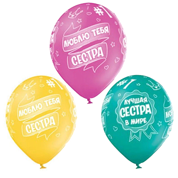 Высококачественный шар из натурального латекса. Ассорти из 3 цветов , одного типа - пастель - матовый оттенок цвета. Шары с пятисторонним - круговая печать, с шелкографическим рисунком на тему Лучшая Сестра в мире, Люблю тебя, Сестра. Предназначен для розничной продажи воздушных шариков. Идеальный ассортимент для праздничных оформлений, т.к. при плетении из него гирлянд - рисунок будет очень хорошо виден.