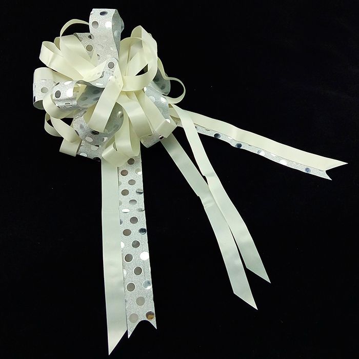 Подарочный бант – шар (гигант) с глиттером "Горох" Белый с серебром состоит из 5-7 лент, скрепленных между собой. Огромное разнообразие, как форм, так и материалов, из которых они сделаны, позволяют с легкостью подобрать нужный подарочный декор.