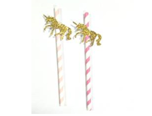 Трубочка для коктейля с декором в виде сияющего золотого единорога из глиттер-бумаги, используется с другими праздничными аксессуарами сладкого стола.
