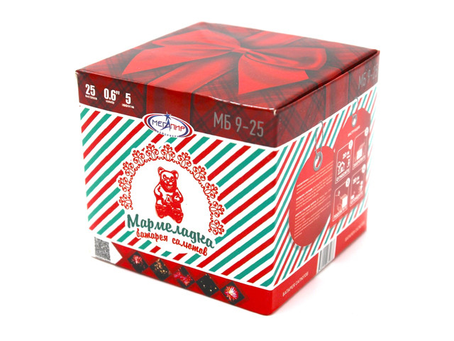 Ваш праздник украсят 25 залпов калибром 0.6"(17мм), радуя вас эффектами, среди которых: Красный хвост, красные звезды, белое мерцание; зеленые звезды, треск; красный хвост, голубые звезды, белое мерцание; зеленый хвост, пурпурные звезды, зеленое мерцание, белое мерцание; красный хвост, красные звезды, красная хризантема, треск. Незабываемые 24 секунд впечатляющего пиротехнического шоу!