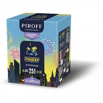 Фейерверк РАНДЕВУ БСП0202508 от производителя пиротехники PIROFF состоит из 5 эффектов: красно-белое мерцание; треск и яркие звезды; серебряное мерцание; цветной мелкий треск; золотой треск.