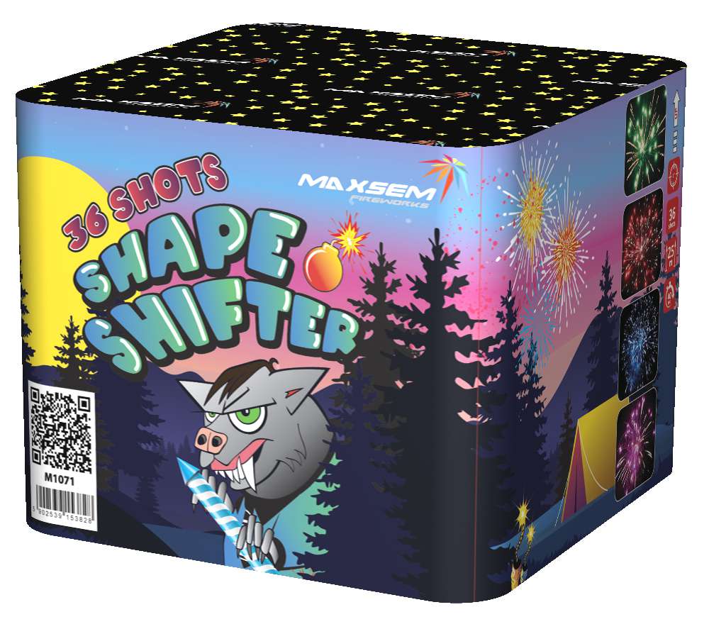 Фейерверк Maxsem Shape Shifter M1071 предоставляет 36 выстрелов. Калибр диаметра ствола 25 мм, высота вылета зарядов достигает 35 метров. Хранить салют рекомендуется в темном сухом месте при комнатной температуре, избегая попадания воды и прямых солнечных лучей. Для приведения фейерверка в действие требуется освободить фитиль из-под наклейки и поджечь на расстоянии вытянутой руки.