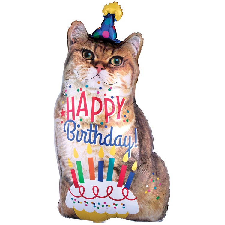 Сложная, объемная фигура в форме кота с надписью Happy Birthday. При надувании рекомендуется использовать гелий. Имеет встроенный клапан - что упрощает надувание. Тонкая миларовая (фольга на полиэтиленовой основе) пленка позволяет шарам не сдуваться от недели до одного месяца.