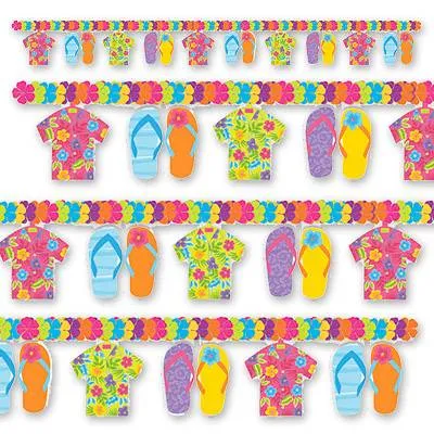 Сочная гирлянда из тканевых гавайских цветов, на которой безмятежно расположились гавайские шлёпки и рубашки (алоха). Любой, кто зайдет на Вашу вечеринку, сразу окунется в атмосферу островного веселья.