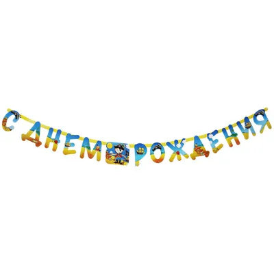 Гирлянда-буквы Веселая затея "С днем рождения: Маленький пират" выполнена из картона и украшена яркими изображениями маленького пирата на острове сокровищ. Карточки скрепляются друг с другом с помощью подвижных металлических соединений. Крайние карточки имеют ниточные петли для удобства крепления гирлянды.