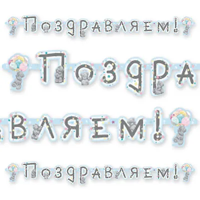 Надпись ПОЗДРАВЛЯЕМ! выполнена в стиле знаменитого мишки Me to You и украшена звездочками и разноцветными шариками. Длина гирлянды: 170 см.