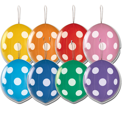 Шар-игрушка, имеющий на верхушке прикрепленную резинку, позволяющую играть им как раскидайчиком. Ассорти из 7-8 цветов. Шары с круговым шелкографическим одноцветным рисунком в виде больших крупных горошин. Предназначенный для использования в розничной продаже, как в надутом, так и в не надутом виде. Можно надувать как воздухом, так и гелием.