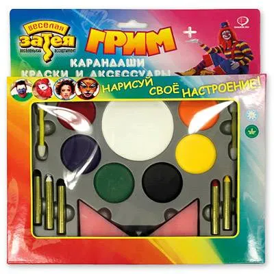 Грим предназначен для нанесения на кожу лица для создания различных образов во время проведения праздников, театральных постановок и маскарадов. Легко наносится и смывается. Безопасен для детской кожи. В наборе: белая краска 2,8гр красная, синяя, зеленая, черная, желтая, оранжевая по 4гр Карандаши: красный, синий, белый, зеленый, желтый, черный по 1,6гр 2 спонжа 2 аппликатора.