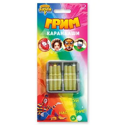 В наборе 6 карандашей по 1,6гр базовых цветов: красный, синий, белый, зеленый, желтый, черный. Грим легко смывается.