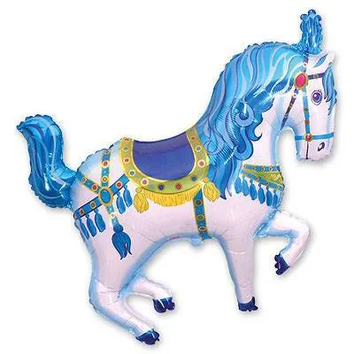 Маленькая фигура Flexmetal Лошадь цирковая голубая. Данный воздушный шар надувают воздухом (насосом для шаров). Шар не имеет клапана, предотвращающего спускание. Поэтому, после надувания, его требуется запаять специальным запайщиком или крепко-крепко перекрутить хвостик. Данные шары закрепляются на специальную палочку с розеткой.