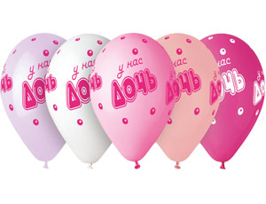 Воздушные шары из натурального латекса c шелкографическим одноцветным рисунком в виде надписи У нас Дочь в обрамдении воздушных пузырьков. Рисунок расположен по всей поверхности шара. В пакете шары 5 цветов бело-розовой гаммы. Надпись в зависимости от цвета шара нанесена белой или розовой краской. Предназначенны для использования как в оформлении, так и в розничной продаже. Размер шаров в надуве - 35 см, продаются ненадутыми, подходят для надува как гелием, так и воздухом при помощи ручного насоса.