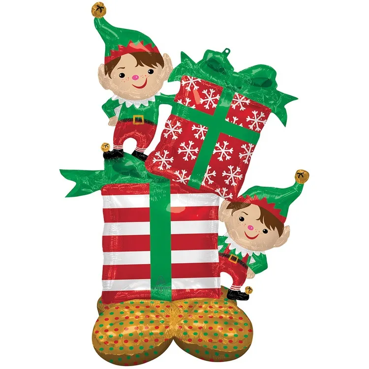 Большой объемный фольгированный шар высотой 134 см в форме рождественского подарка и Эльфов. Такую фигуру можно использовать как самостоятельную декорацию новогоднего праздника. Данный шар надувается ВОЗДУХОМ. Тонкая миларовая пленка (фольга на полиэтиленовой основе) позволяет шарам не сдуваться от недели до одного месяца. Упакован в красочный пакет, с цветным изображением шара, что позволяет выставлять товар в не надутом виде. Схема надува прилагается в комплекте к шару.