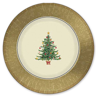 Элегантные тарелки с широким ободком цвета античного золота и тонко- прорисованной елкой. Изысканный выбор для встречи Нового года в классическом стиле.