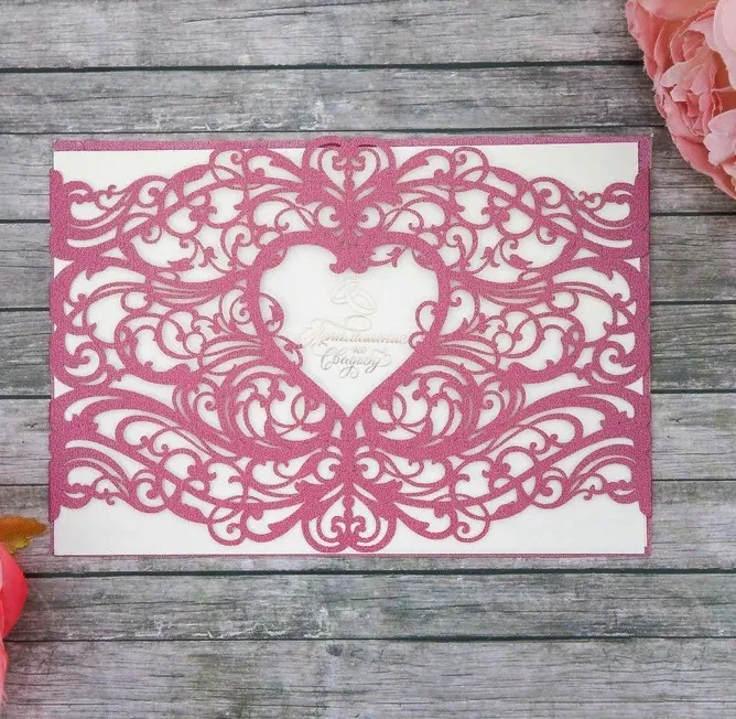 Оно выполнено в форме открытки. Материалы — дизайнерский картон и атласный бант. Карточка изготовлена с помощью лазерной резки, благодаря чему выглядит благородно. Текст со свободными полями для имени адресата, времени, даты и адреса проведения мероприятия напечатан на плотной бумаге, которая вкладывается в открытку.