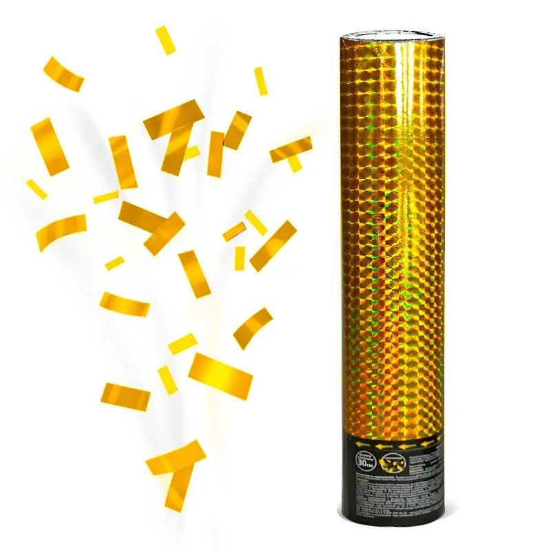 Хлопушка «Голография» Золотое конфетти идеальна для использования на любом праздничном мероприятии. Выстрел фольгированными прямоугольными золотыми конфетти высотой 7-8 метров порадует всех гостей мероприятия, а ультрасияющая упаковка хлопушки универсальна и подойдет для любого формата торжества.