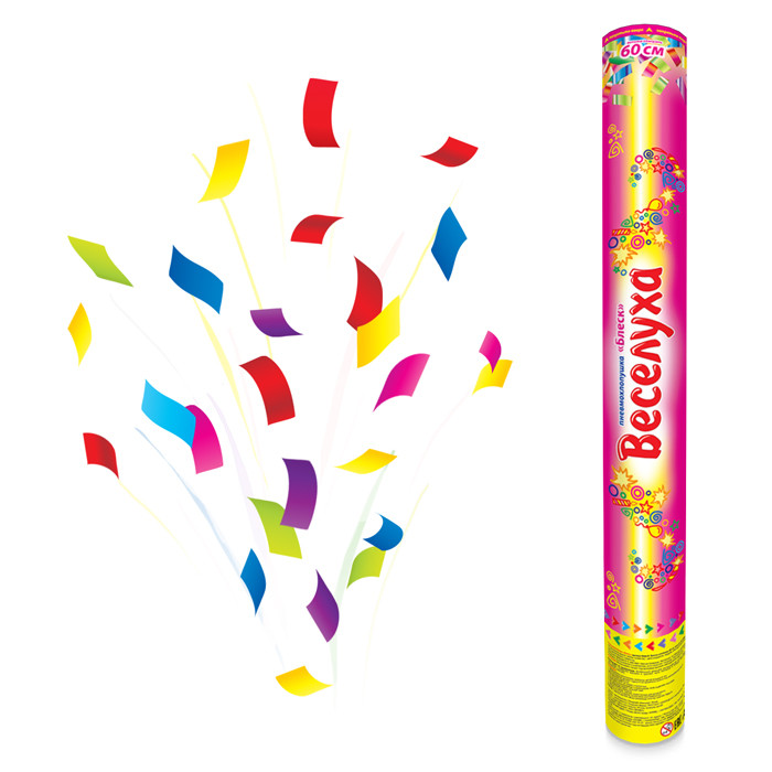 Эта хлопушка украсит любое торжество – свадьбу, юбилей, корпоративный или детский праздник. Фонтан из разноцветных конфетти высотой 7-8 метров поможет придать празднику сказочную атмосферу.