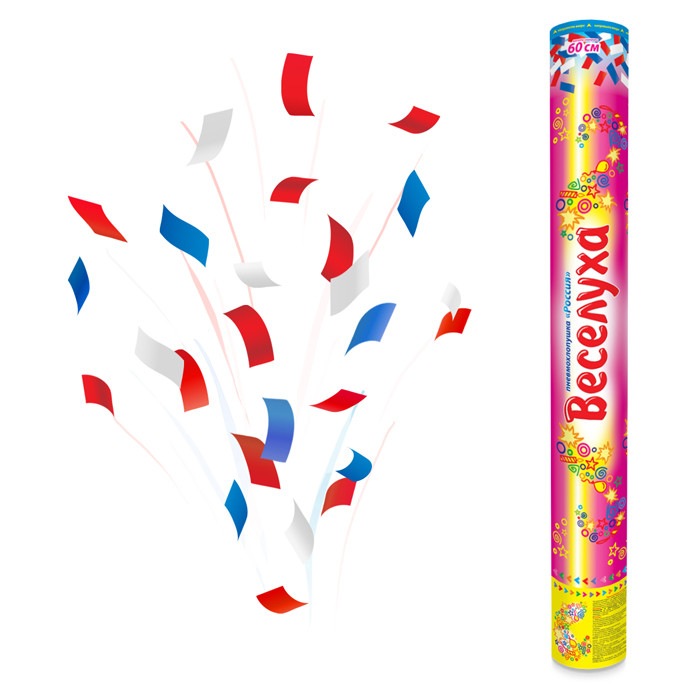 Эта хлопушка станет украшением любого события – корпоративного праздника, спортивного мероприятия, Дня рождения, юбилея или другого торжества. Фонтан из конфетти белого, синего и красного цвета создаст праздничную атмосферу и порадует всех участников торжества. Высота выстрела хлопушки 5-8 метров.