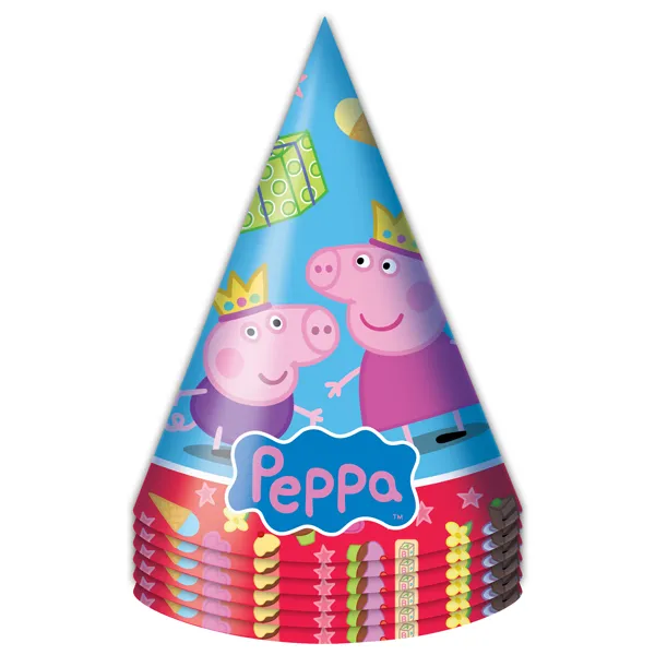 У Свинки Пеппы день рождения, и она так рада принимать подарки вместе со своим братом Джорджем. Все гости нарядились в костюмы и пришли к Пеппе на праздник-маскарад. А если Ваши гости забыли костюмы, вы можете предложить им нарядные колпачки с Пеппой. В упаковке 6 колпаков на резинках.