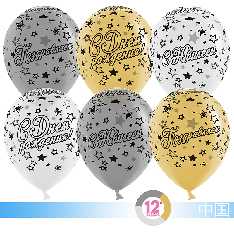 Высококачественный шар из натурального латекса, китайского производства, ассорти из 3-х цветов: Белый/Золото/Серебро. Шары с пятисторонним шелкографическим рисунком. Идеальный ассортимент для розничной продажи воздушных шаров и украшения праздника.
