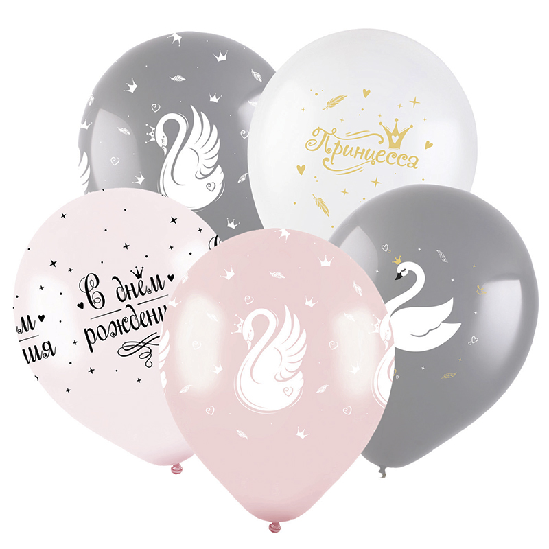 Набор воздушных шаров "Принцесса-лебедь" порадует вас нежными дизайнами: роскошная лебедь, надпись принцесса, фраза «С днем рождения». В наборе микс из полноцветной печати, 5ти сторонней и 2хсторонней печатью золотом. Ассорти дизайнов подойдет как для поздравления с Днем рождения, так и для стильных оформлений.