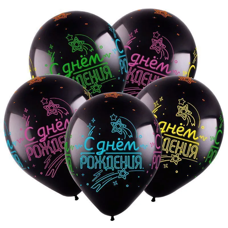 Набор воздушных шаров "С Днем рождения, Неон" состоит из одного дизайна. Печать выполнена с 5 сторон, каждая сторона запечатана разным цветом: оранжевым, розовым, желтым, зеленым, голубым