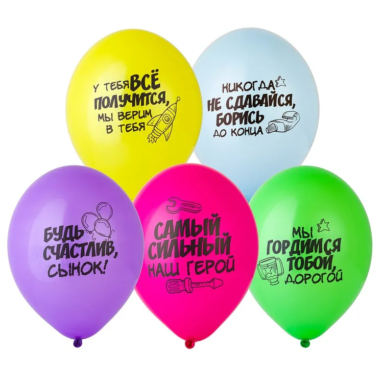 Высококачественный шар из натурального латекса. Пастель - матоввые шары, с двухсторонним шелкографическими текстовыми рисунками-пожеланиями для сыночка, с большим полем печати. Идеальный ассортимент для розничной продажи воздушных шариков и украшения праздника. Воздушные шары изготавливаются из экологически безопасного 100%-ного натурального латекса. В окружающей среде разлагаются на безопасные компоненты примерно с той-же скоростью, как обычные листья деревьев. После использования лопнуть и утилизировать как бытовой отход.
