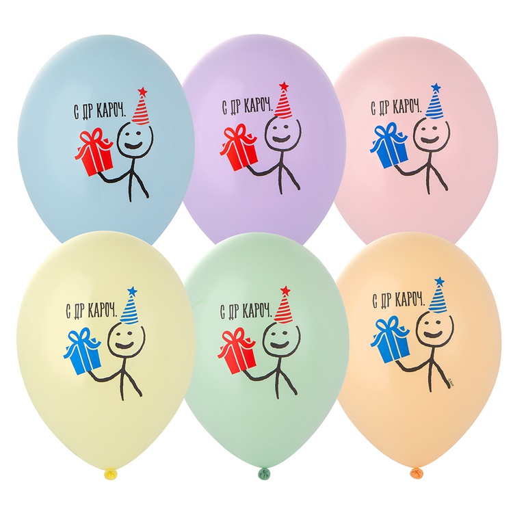 Высококачественный шар из натурального латекса. Ассорти из 10-12 цветов, типа пастель. Шары с двусторонним шелкографическим рисунком. Идеальный ассортимент для розничной продажи воздушных шариков.