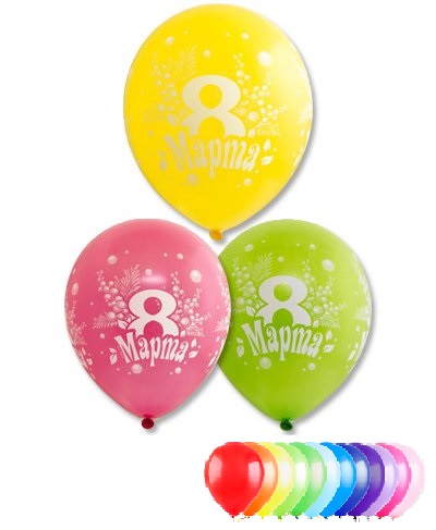 Шары из натурального латекса, c шелкографическим рисунком одного цвета. Печать с четырех сторон. Все шары одного дизайна - 8 Марта. Тип шара пастель - матовый оттенок цвета. Ассорти из 8-10 цветов. Предназначенны для использования в розничной продаже как в надутом, так и в не надутом виде.