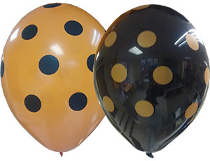 Черные шары в рыжий горох и оранжевые - в черный горох. Настоящий Хэллоуин, когда белое становится черным...и наоборот! Шары матовые, с многосторонним шелкографическим рисунком. Размер шаров в надуве: 35 см. Они подходят как для надува воздухом, так и заполнения гелием. В упаковке: 25 шаров.