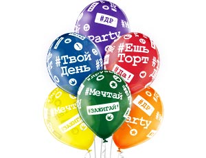 Высококачественный шар из натурального латекса, прозрачный кристалл. Шары с пятисторонним - круговая печать, шелкографическим рисунком - Хештеги. #Твой день, #Ешь торт, #ДР, #Зажигай, #Мечтай, #Party - модные надписи на больших шариках, однозначно, понравятся каждому. Предназначен для розничной продажи воздушных шариков. Идеальный ассортимент для оформлений, т.к. при плетении из него гирлянд - рисунок будет очень хорошо виден. Ассорти ярких цветов.