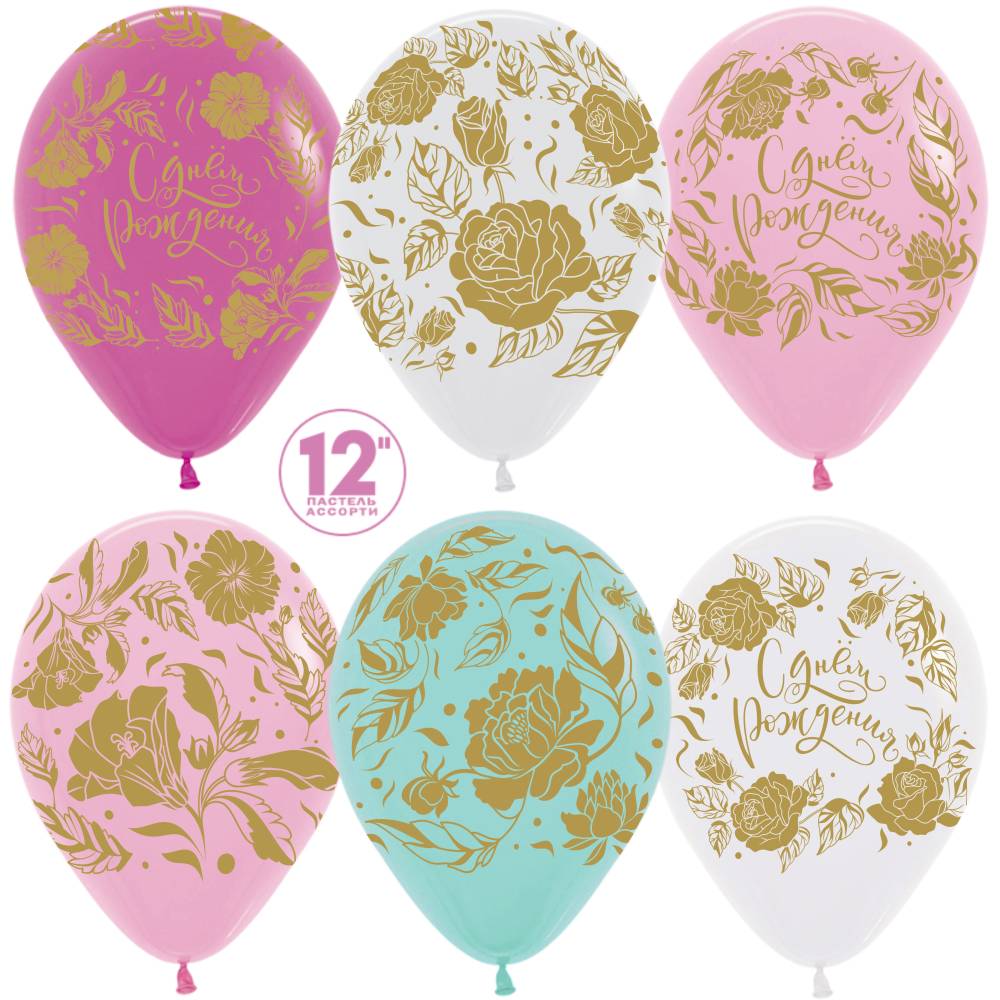 С Днем рождения!(золотые цветы) 12", пастель (Колумбия) / 50 шт