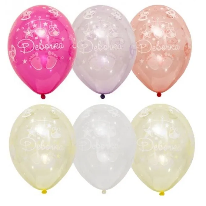 Высококачественный шар из натурального латекса. Одного типа - кристалл bubble - нежные прозрачные тона. Шары с пятисторонним - круговая печать, шелкографическим рисунком С Рождением Девочка. Пяточки, коляски, соски, игрушки. погремушки. Предназначен для розничной продажи воздушных шариков и праздничного оформления. Воздушные шары изготавливаются из экологически безопасного 100%-ного натурального латекса. В окружающей среде разлагаются на безопасные компоненты примерно с той-же скоростью, как обычные листья деревьев. После использования лопнуть и утилизировать как бытовой отход.