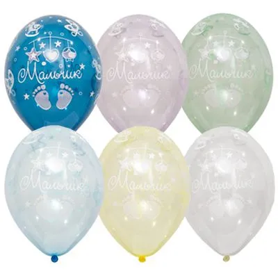 Высококачественный шар из натурального латекса. Одного типа - кристалл bubble - нежные прозрачные тона. Шары с пятисторонним - круговая печать, шелкографическим рисунком С Рождением Девочка. Пяточки, коляски, соски, игрушки. погремушки. Предназначен для розничной продажи воздушных шариков и праздничного оформления. Воздушные шары изготавливаются из экологически безопасного 100%-ного натурального латекса. В окружающей среде разлагаются на безопасные компоненты примерно с той-же скоростью, как обычные листья деревьев. После использования лопнуть и утилизировать как бытовой отход.
