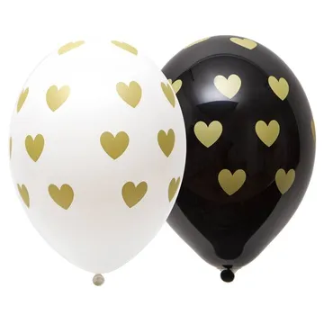 Высококачественный шар из натурального латекса. Черного и белого цветов. Шары с пятисторонним - круговая печать, шелкографическим рисунком Сердца золотые. Предназначен для розничной продажи воздушных шариков. Идеальный ассортимент для свадебных оформлений и ко Дню Святого Валентина, т.к. при плетении из него гирлянд - рисунок будет очень хорошо виден. Продукция на тему Любовь к свадебе, ко Дню Святого Валентина, к 8 Марта.