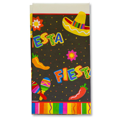 Жарко, ярко и весело! Вот это настоящая мексиканская фиеста! Для оформления праздничного стола пригодится стилизованная бумажная скатерть. В центре она белая, а по краям украшена невероятными красочными рисунками на черном фоне. Здесь есть все, с чем у нас ассоциируется Мексика: маракасы, красные острые перцы, сомбреро, полосатый орнамент.