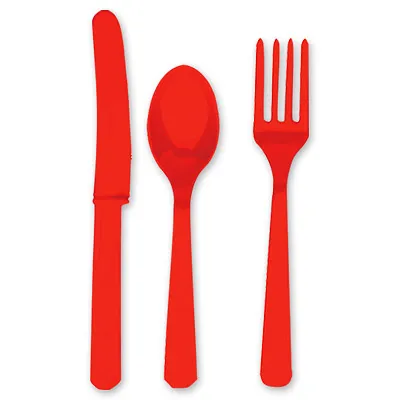 Нож, вилка, ложка - столовые приборы для праздника, комплект красного цвета - очень облегчит жизнь хозяйки. Используется совместно с другими элементами коллекции по дизайну (тарелки, стаканы, салфетки, скатерти и т. п.). Приборы изготовлены из качественной пищевой пластмассы,к тому же безопасны в использовании, можно смело доверить их детям.