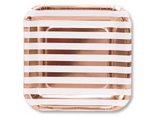 Нарядные бумажные тарелки с полосками цвета розового золота. Универсальны, подходит для любого праздничного фуршета. Выглядят стильн о, нарядно и ярко. В наборе 6 тарелок размером 25 см. Купить красивую одноразовую посуду оптом можно на нашем сайте.