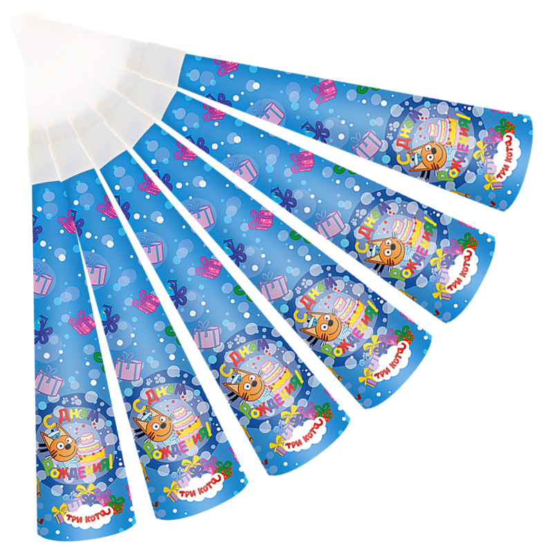Игрушки-свистульки горны, издавая забавные звуки, предадут празднику веселья и шума, что так нравится детям! Рекомендуем использовать вместе с другими элементами из коллекции "Три кота" (тарелки, стаканчики, колпаки, языки, салфетки, свечи, хлопушки, мыльные пузыри)