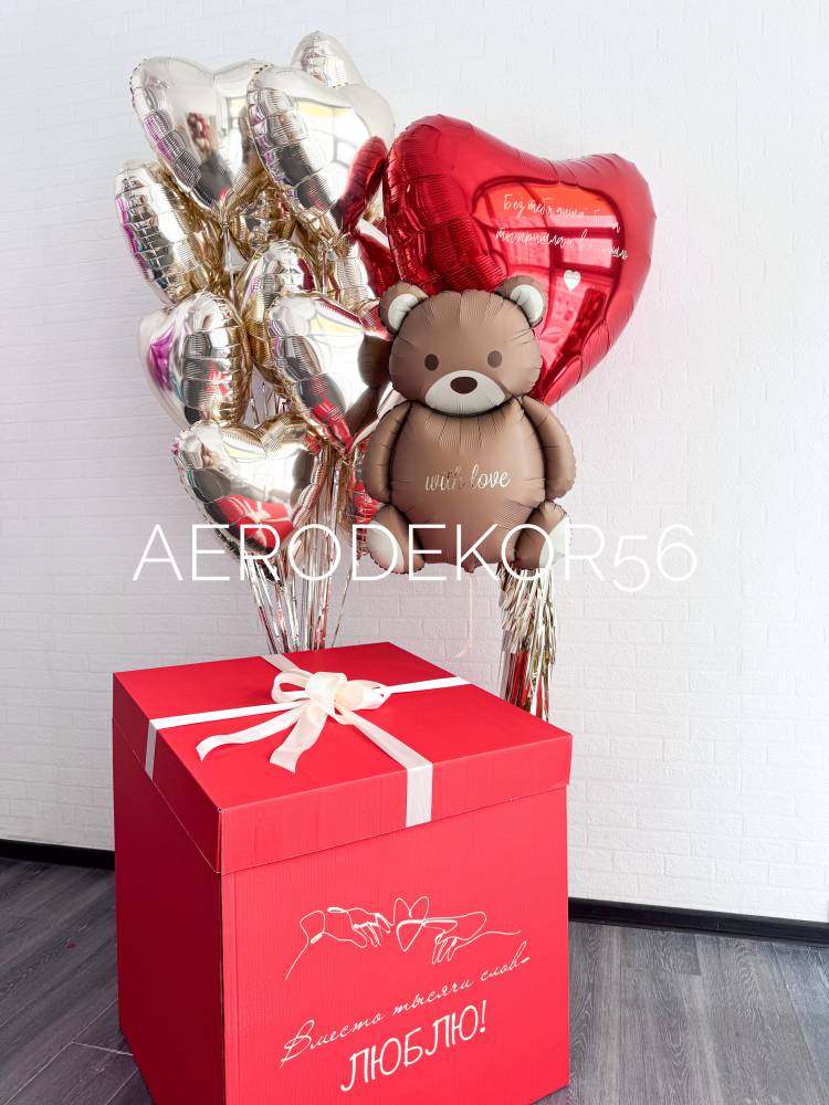 фольгированное сердце 10шт, фольгированное сердце гигант с индивидуальной надписью 1шт, фольгированный мишка 1шт, коробка с индивидуальной надписью и бантом 1шт, грузик 3шт