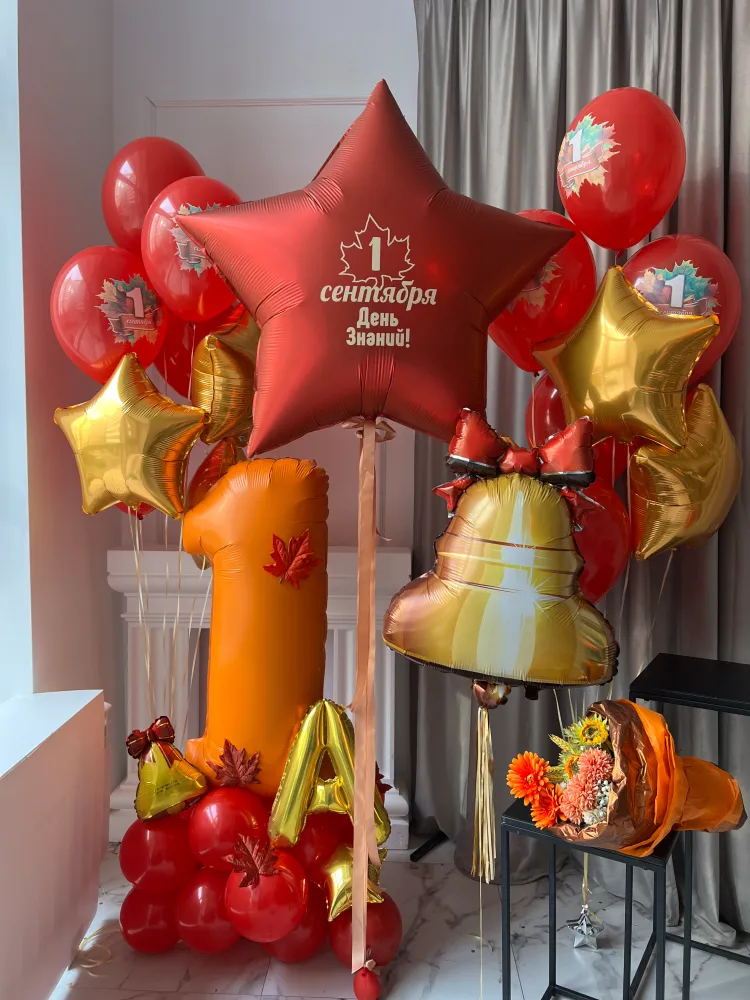 фольгированная звезда 6 шт, шар с рисунком 10 шт, фольгированная звезда гигант 1шт, фольгированный колокольчик 1шт, фольгированная цифра на подставке 1шт, грузик 4шт