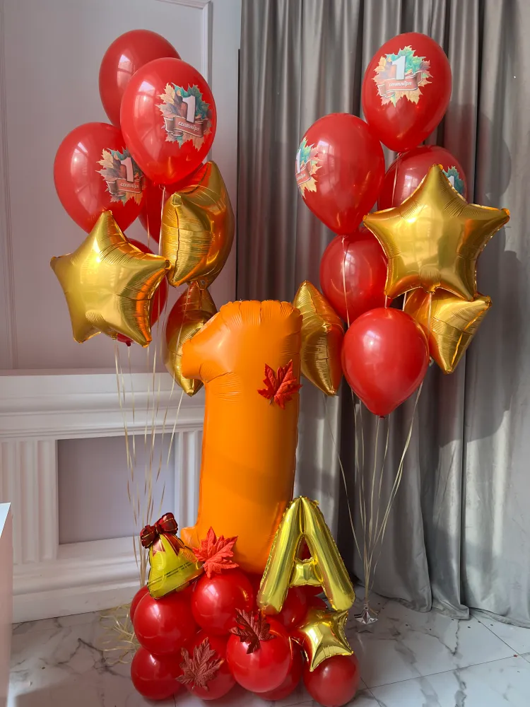 фольгированная звезда 6 шт, шар с рисунком 10 шт, фольгированная цифра на подставке 1шт, грузик 2шт