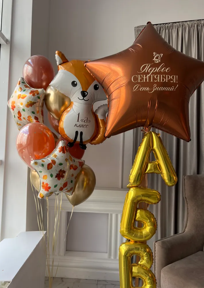 шар хром 4шт. шар дабл-стаф 4шт, фольгированная звезда с исунком 2шт. фольгированная лиса 1шт, фольгированная звезда с индивидуальной надписью 1шт. фольгированная буква 3шт. грузик 2шт