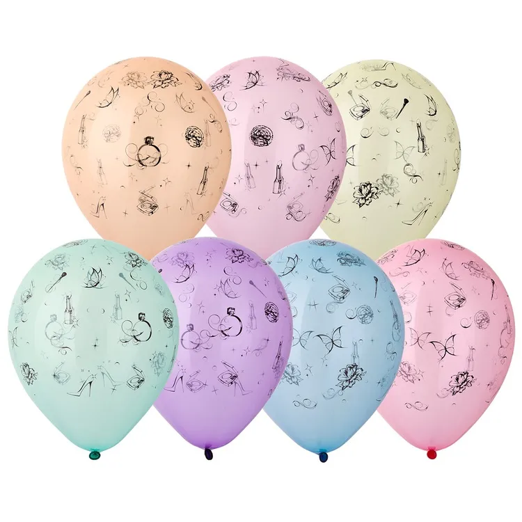 Шары из натурального латекса c шелкографическим рисунком одного цвета. Печать с четырех сторон. Все шары одного дизайна. Тип шара пастель - матовый оттенок цвета. Ассорти из 8-10 цветов. Предназначенны для использования в розничной продаже как в надутом, так и в не надутом виде.