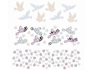 Нежное конфетти для влюблённфх в трех дизайнах: розовые, прозрачные, и белые сердечки; перламутровые и белые голуби; сердца и надпись Love. Конфетти можно рассыпать на столах, положить в конверт с признанием в любви, добавить в подарок или воздушный шарик.