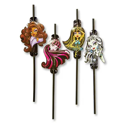 Черные пластиковые соломинки для коктейля с портретами Клодины Вульф, Фрэнки Штейн, Дракулауры и Клео де Нил.