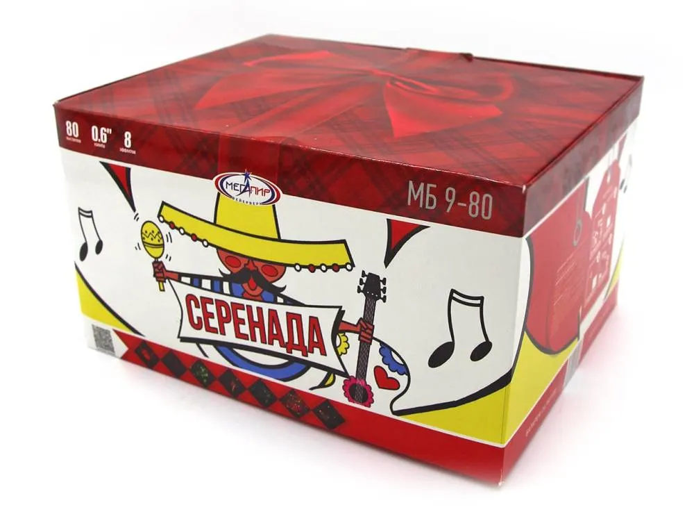 Ваш праздник украсят 16 залпов калибром 0.6"(17мм), радуя вас эффектами, среди которых: Красный хвост, красный кокос, белое мерцание; зеленый хвост, зеленый кокос, золотое мерцание; голубой хвост, пурпурный кокос, зеленое мерцание; красный хвост, красный кокос, зеленый кокос, дождь. Незабываемые 18 секунд впечатляющего пиротехнического шоу!