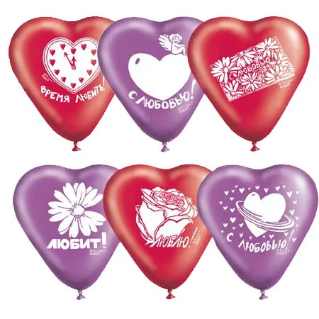 Шар из натурального латекса в виде объемной фигуры, повторяющей форму сердца. В пакете шары двух цветов. Шары с шелкографическим рисунком (5-6 дизайнов, одной темы в пакете). Предназначенный для использования в оформлении и розничной продаже.