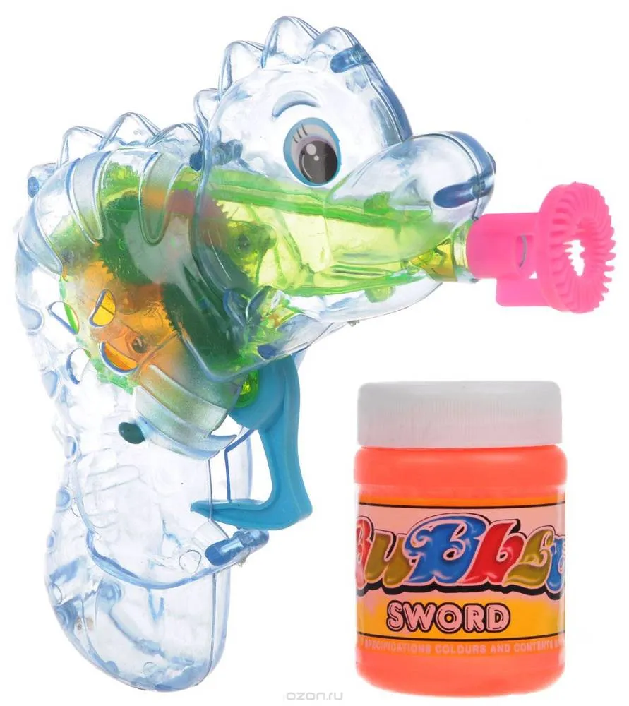 В комплекте для выдувания мыльных пузырей: пластиковый пистолет, пузырек с мыльным раствором и батарейки.