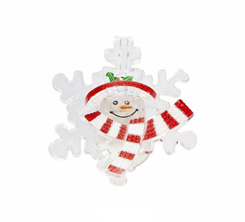 Фигура светодиодная выполнена из пластика в виде "Снежинки со снеговиком". В центре фигуры расположен яркий RGB светодиод, который непрерывно меняет цвет свечения. С тыльной стороны фигуры прикреплен блок питания с батарейками типа CR2032. К блоку питания прикреплена присоска, которая позволит прикрепить фигуру на стекло или любую другую ровную поверхность.